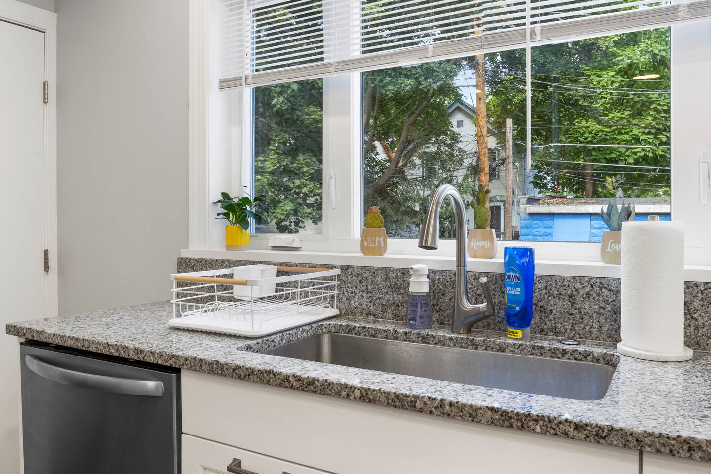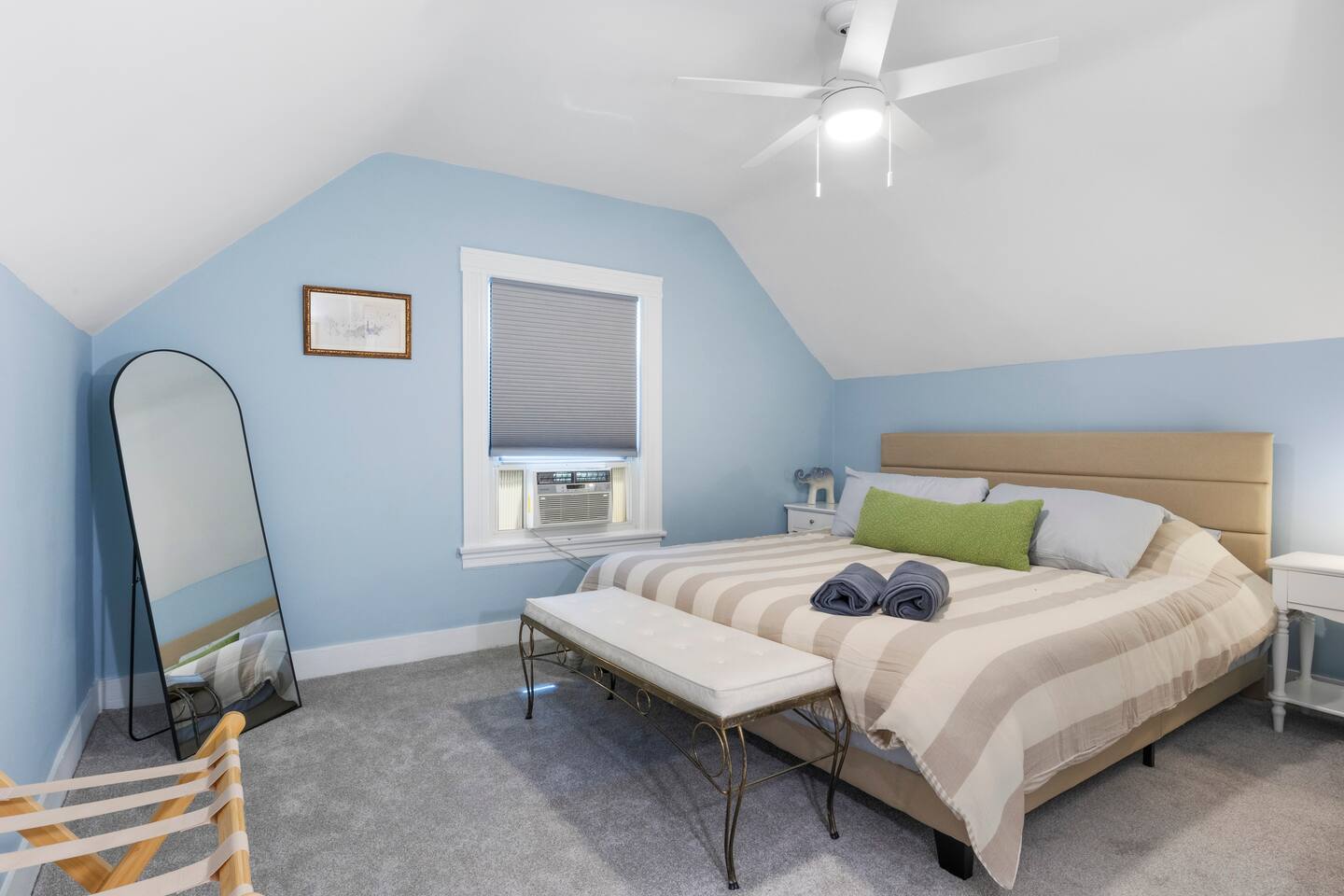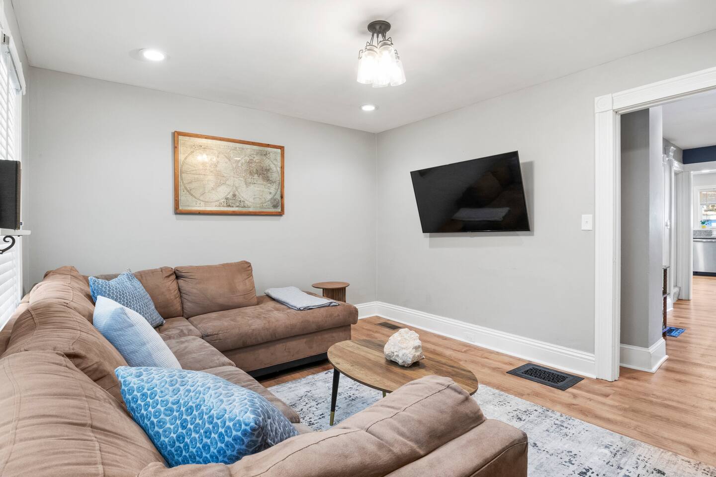 KEY FEATURES ☀ Spacious 1696 sq ft 3 Bedroom home with first floor Full bed and second floor King & Queen beds ☀ 1.5 bathrooms - 1 full upstairs and 1/2 bath downstairs ☀ OFF STREET PARKING - 3 spots back to back in the driveway with the gate open ☀ Full kitchen, with all the tools needed to make a delicious meal! (dishwasher is available for guest use) ☀ Stocked coffee bar with coffee grounds, K-cups and creamer ☀ Salt, pepper, and various spices are provided ☀ 55” flat screen TV with access to all streaming platforms (logins not provided) ☀ Free High Speed WiFi ☀ Washer + dryer located in basement for guest use ☀ Easy keypad access into home ☀ Dedicated Workspace area for those needing to work remotely ☀ Small private backyard chiminea firepit, and outdoor furniture set ☀ Very Convenient location; Walkable to charming Park Ave; short drive to universities, museums, hospitals, restaurants and stores ☀ 1800s home with character and quirks ☆☆ BEDROOMS & LIVING AREA ☆☆ Ultimate comfort and relaxation awaits you on our King/Queen/Full Memory Foam mattresses. MCM Living Room contains large sectional and 55" Smart TV to watch all of your favorite shows on. Netflix, Hulu, Disney+, Apple TV are all available for your use, but you will need to provide your own login. Stairs to upstairs bedrooms and landing are steep, recommended to use banister for guest safety. ☆☆ BATHROOMS ☆☆ One full size and one half bath complete with plush bath linens, hairdryer and first aid kit. 1 first floor half bathroom located off the kitchen and 1 full second floor bathroom. ☆☆ KITCHEN & DINING ROOM ☆☆ The fully equipped kitchen has everything you’ll need for whipping up tasty meals for the whole group, including stainless steel appliances, a toaster, a Keurig, Coffee pot and all the basic kitchen essentials like pots, pans, plates, cups, and utensils. Enjoy meals together at the kitchen table with seating for 6. Dishwasher is available - few pods will be provided. There is a stocked coffee bar with assorted coffee grounds/K-cups and creamer. Salt, pepper, and various spices are also included! ☆☆ LAUNDRY ROOM ☆☆ Full size washer and dryer located in the basement. Iron and steamer available in bedroom closet. Detergent will be provided for guest use near units ☆☆ OUTSIDE SPACE ☆☆ Step out back into your quiet and private oasis - steps away from the bustling Park Ave area. The backyard features a chiminea fire pit, comfortable outdoor patio set. ★☆ Book Today & Let Us Take Care Of You In ROCHESTER NY! ☆★
